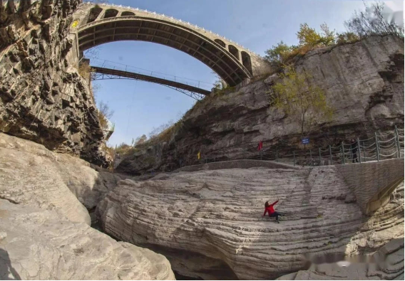 到达目的地后大家不由对眼前的景色所震撼,就如旧时民谣里所描述的“头顶九龙群峰立,脚踏玄武万丈崖。迎面凤凰展翅飞,龟蛇二将镇东西”,说的是龙潭峡谷北面紧靠石岗岩壁,形成了一道天然寨墙,唯有岩壁正中一条道路通向北山。